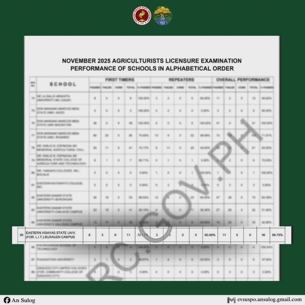 𝗕𝗥𝗘𝗔𝗞𝗜𝗡𝗚: Eastern Visayas State University–Burauen Campus (EVSU-BC,) proudly produces eleven (11) new Licensed Agriculturists as of the results released today, Tuesday, December 02, from the recently concluded November 2025 Agriculturists Licensure Examination (ALE). As per the Professional Regulation Commission (PRC), EVSU–Burauen Campus records a strong performance with eight (