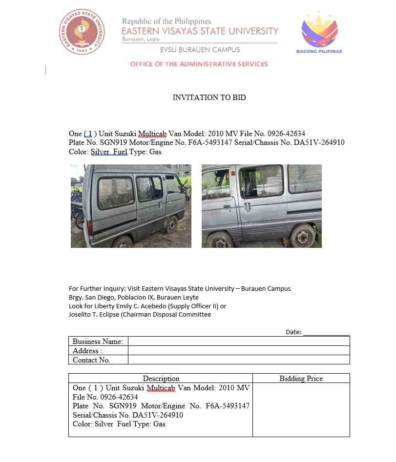 The Eastern Visayas State University – Burauen Campus, through its Office of the Administrative Services, invites interested bidders to participate in the public bidding for: