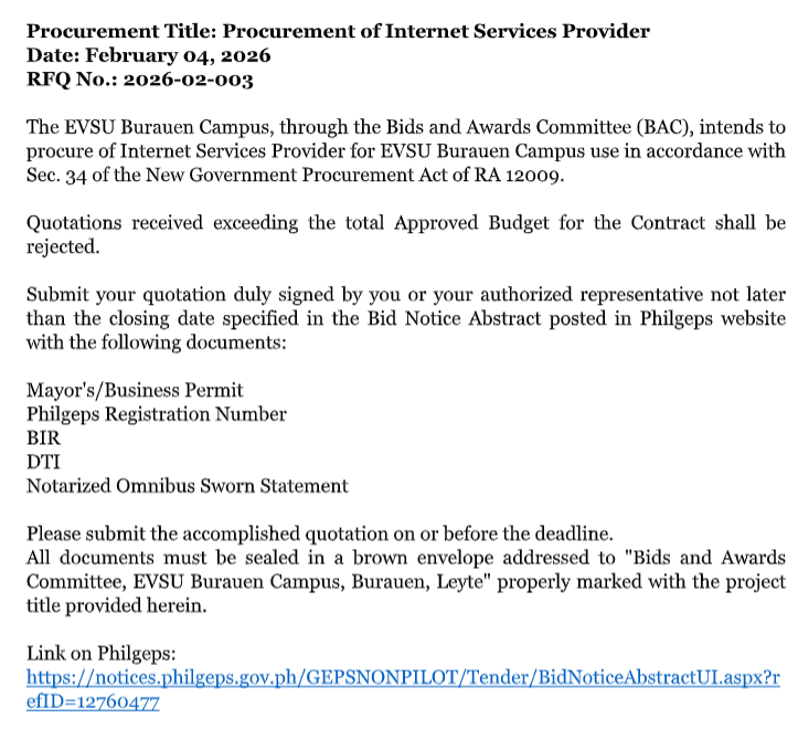 The EVSU Burauen Campus, through the Bids and Awards Committee (BAC), intends to
